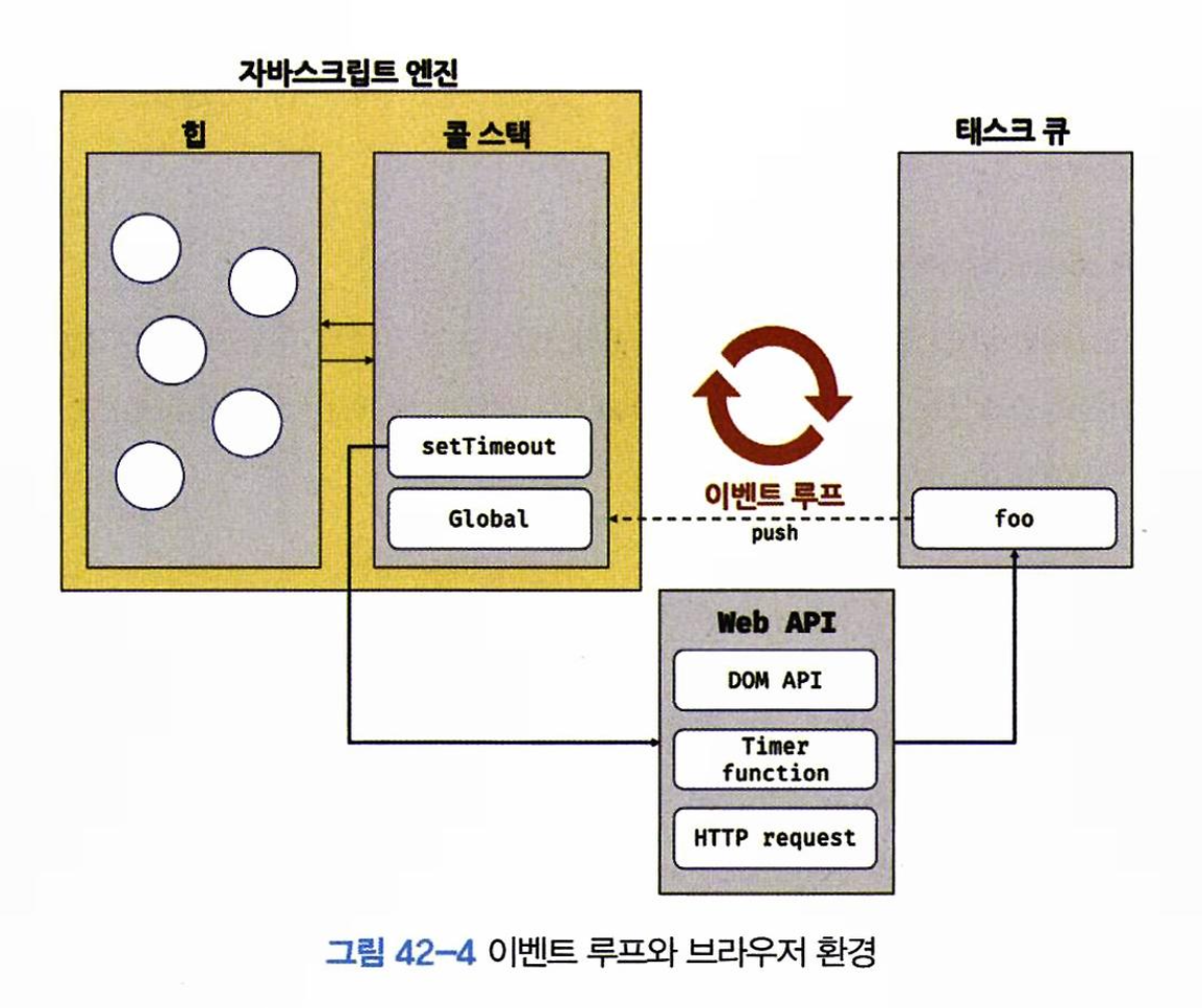 - setTimeout 함수가 실행되면 콜백 함수를 호출 스케줄링 후 종료되어 콜 스택에서 팝된다. 이때 타이머 설정과 타이머 만료 시 콜백 함수를 태스크 큐에 푸시하는 것은 브라우저다.