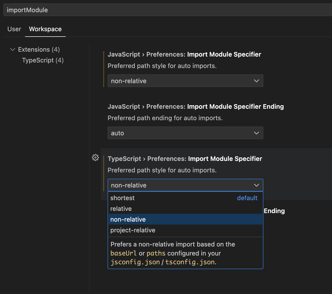 Workspace 설정에 들어가 importModule을 검색하면 아래와 같이 나옵니다.
