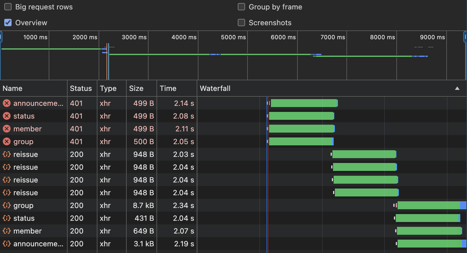 - 이 경우 짧은 시간에 여러 요청이 거의 동시에 401 상태를 반환하여 refreshToken 호출이 중복될 가능성이 높아진다.